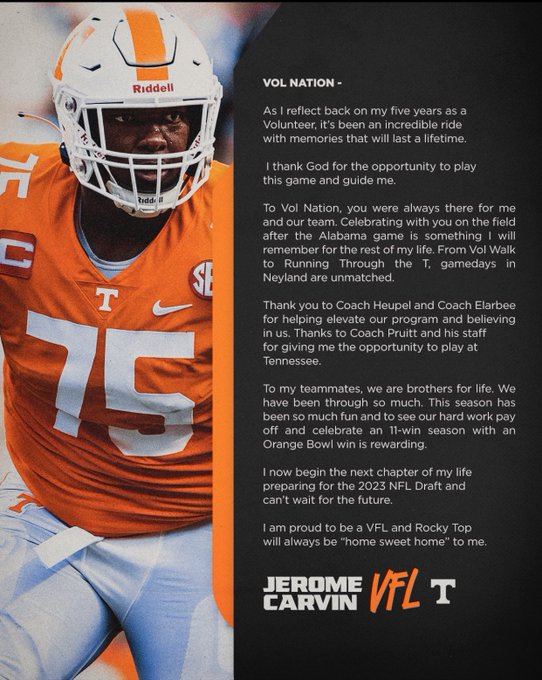“I now begin the next chapter of my life preparing for the 2023 NFL Draft and can’t wait for the future. I am proud to be a VFL and Rocky Top will always be “home sweet home.”
