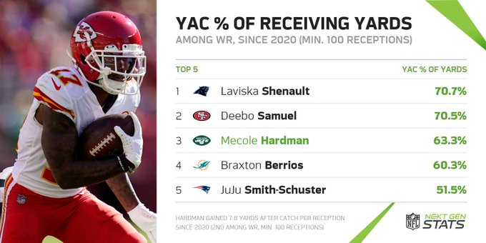 After being selected by the Chiefs in the second round of the 2019 draft, Hardman’s most productive season was in 2021. He achieved personal career bests with 59 receptions and 693 receiving yards.