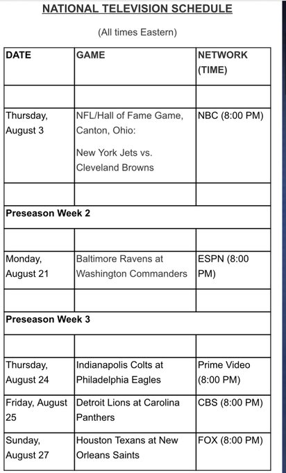 The preseason kicks off with the New York Jets facing the Cleveland Browns at Tom Benson Hall of Fame Stadium in Canton, Ohio, on Thursday, August 3. The game will be nationally televised by NBC at 8:00 p.m. ET.